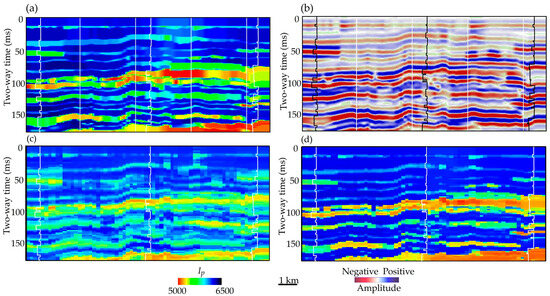 This is a test of an ML-based inversion workflow. (a) The true model represents the realistic acoustic impedance (Ip) of an interbedded sandstone and shale formation. (b) A 60 Hz Ricker wavelet with a phase shift of 90° is generated from the true model shown in part (a). However, this display omits thickness information. (c) The testing results using a large training data set from a single well achieve the limited recovery of the true thickness variation. (d) In contrast, testing results using a large synthetic training data set composed of 500 wells are able to recover most of the high-resolution details shown in part (a). The logs from the three wells are used solely for blind testing purposes. Modified from Zeng [13].