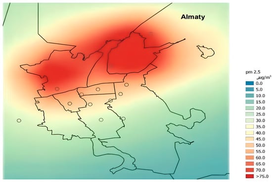 Annual average concentrations of PM2.5 in atmospheric air in Almaty (Circular markers on the map indicate geographical coordinates of stationary air quality monitoring stations. These measuring points represent the initial values of PM2.5 concentrations.).