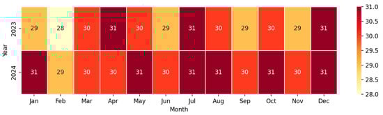 Almaty is the largest megacity of Kazakhstan, which annually ranks among the cities with the highest level of air pollution (see Figure 1) in the region. The geographical location in the foothill basin and high density of buildings contribute to the accumulation of harmful impurities, which is confirmed by monitoring data: average annual concentrations of PM2.5 and NO2 exceed WHO permissible standards 2–3 times (see Figure 2). In 2024, the number of days with clean air when the daily average PM2.5 concentration remained within the WHO guidelines (daily average of 15 µg/m3) increased compared to 2023. While in 2023 there were only 137 such days, in 2024 there were 164.