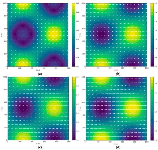 At ground level (z = 0 m), the air velocity (see Figure 3a) is characterized by comparatively low values: the average velocity is about 0.76 m/s, with the maximum value reaching 1.67 m/s. This is typical for the boundary layer, where the influence of surface friction is significant. At a height of 131.6 m (see Figure 3b), the average velocity increases to 1.66 m/s, which reflects the decrease in the influence of surface friction. At a height of 263.2 m (see Figure 3c), the average velocity reaches 2.24 m/s, and at a level of 500 m (see Figure 3d), it is already 3.01 m/s with a maximum value of up to 4.0 m/s.