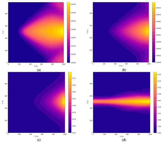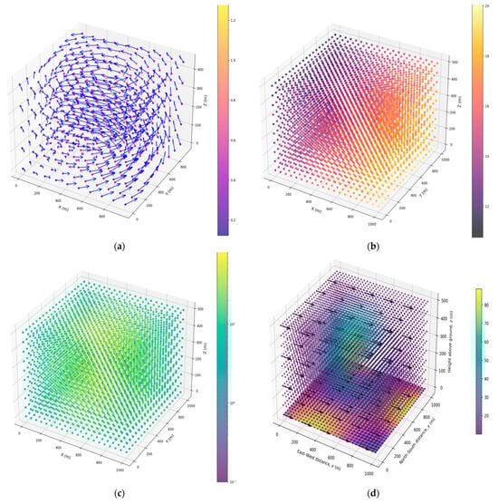 Figure 6 shows the three-dimensional distribution of air velocity, temperature, and concentration in a simulated area measuring 1000 × 1000 × 500 m. For each level along the Z axis (from 0 to 500 m), the average values of the parameters were calculated.