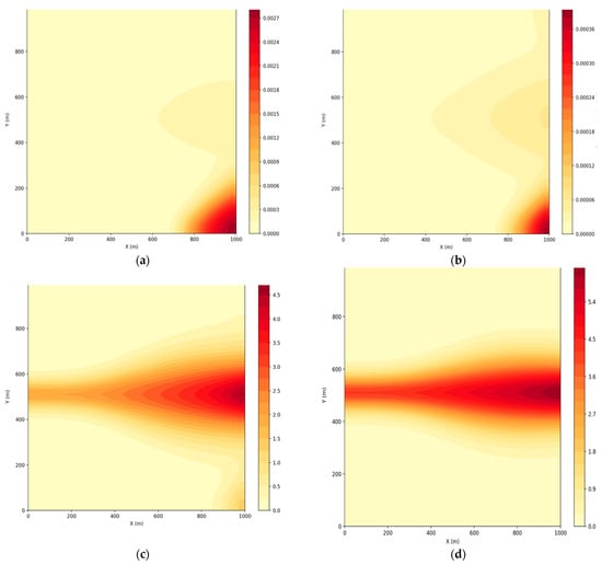 Distribution of pollution concentration at (a) , (b) , (c) , (d) m.