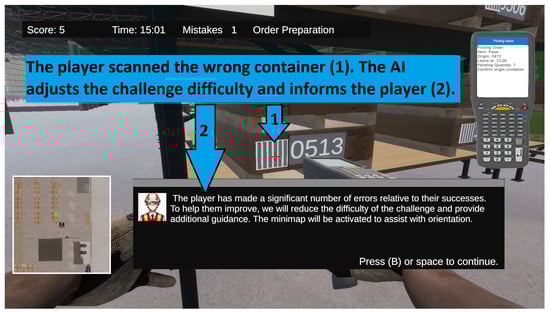 | If the player makes a mistake, the AI is notified with details about where the error occurred, the challenge the player was attempting, and a request for an assessment of the mistake. | The player has just made an error while scanning the location of the container. The scanned label is incorrect. I want you to analyze whether it is necessary to assist the player. The assistance you can provide falls into three categories: (A) Add more in-game assistance: In this case, you could activate the minimap and highlight the location to help the player orient themselves better. (B) In addition to the above, if the player has made too many mistakes, reduce the difficulty of the challenge. This means adjusting the challenge to a lower level. (C) Do nothing: If the number of mistakes is not high enough compared to the difficulty of the challenge and the player’s level, no adjustments are necessary. |