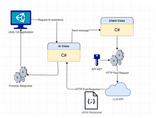 - Request AI assistance: From the Unity-based application, which serves as a 3D simulator, requests are sent to the AI for assistance in various aspects of training. These requests are handled by the corresponding class within the application, depending on the AI model used, ensuring efficient and adaptive communication with the selected API.