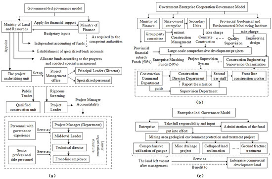 Three administration models of coal mines. (a) Government-led governance model. (b) Government–enterprise cooperation governance model. (c) Enterprise-led governance model.