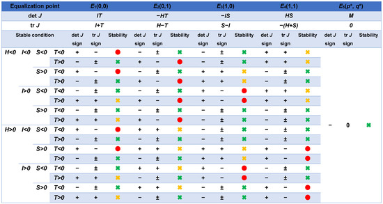 According to the criteria for determining stability specified by Arnoldi in the article, the sign of the determinant and the trace of the matrix J(p, q) can be used to determine the stability of this point. The point in question is only considered a stable node when the determinant of the matrix J is greater than zero and the trace is less than zero [47].