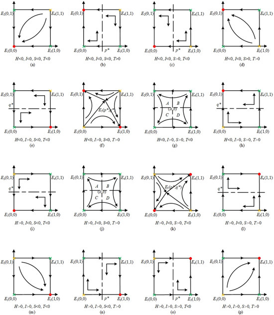 Phase diagram of coal mine replicator dynamics equation. (a) is the case where H, I, S and T are all less than zero. (b) is the case where H, I, S are all less than zero; T is greater than zero. (c) is the case where H, I, T are all less than zero; S is greater than zero. (d) is the case where H and I are less than zero; S and T are greater than zero. (e) is the case where H, S and T are less than zero; I is greater than zero. (f) is the case where H and S are less than zero; I and T are greater than zero. (g) is the case where H and T are less than zero; I and S are greater than zero. (h) is the case where H is less than zero; I, S and T are greater than zero. (i) is the case where H is greater than zero; I, S and T are less than zero. (j) is the case where H and T are greater than zero; I and S are less than zero. (k) is the case where H and S are greater than zero; I and T are less than zero. (l) is the case where H, S and T are greater than zero; I is less than zero. (m) is the case where H and I are greater than zero; S and T are less than zero. (n) is the case where H, I and T are greater than zero; S is less than zero. (o) is the case where H, I and S are greater than zero; T is less than zero. (p) is the case where H, I, S and T are greater than zero. ● represents stable node; ✖ represents saddle point; ✖ represents instability point. Inference 2: When H < 0, T > 0, except for I > 0, S < 0, the evolutionary stability strategy of the system is (0,1).