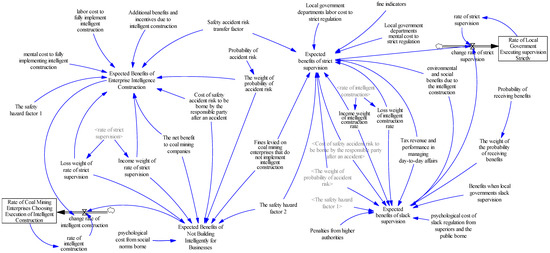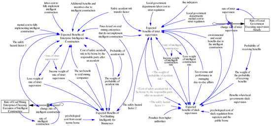 Following the game hypothesis and analysis mentioned above, this study employs Vensim PLE 7.3.5 and MATLAB 9.12.0 to construct a two-agent evolutionary game SD model comprising two subsystems: the coal mining enterprise and the local government. As illustrated in Figure 4, the model contains two horizontal variables, two rate variables, eight intermediate variables, and twenty external variables. Specifically, the rate of coal mining enterprises choosing the execution of intelligent construction and the rate of local government executing supervision strictly are expressed as two horizontal variables; change rate of intelligent construction and change rate of strict supervision are expressed as two rate variables; and the external variables are in alignment with the variable values presented in the income matrix presented in Table 2. Furthermore, the functional relationships between variables and the flow rate formulas in the SD model are primarily derived from the game analysis above and replication dynamic equations, precisely Type 11 and Type 14.