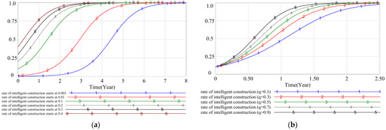 However, initial probabilities exert a certain influence on the pace of system evolution. This implies that the initial degree of supervision by government departments and the initial stage of enterprise construction may have an impact on the process of achieving comprehensive intelligent construction. In other words, for enterprises at the same level of construction, the stricter the government’s initial supervision in a particular district, the faster and more comprehensive the construction process in that district will be. Furthermore, the higher the starting point of intelligent construction for enterprises in this process, the slower subsequent progress will be. For enterprises that are about to complete intelligent construction, the more challenging it will be to resolve the ‘last mile’ issue.