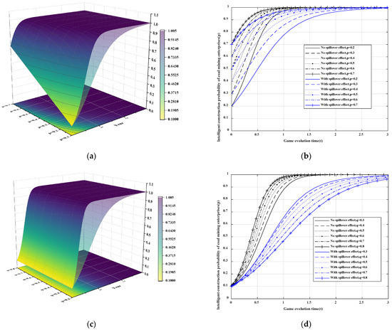 Similarly, we analyze the extent to which spillover penalties affect the probability of strict government oversight, using the probability of strict government oversight as the vertical axis. This finding is in alignment with the aforementioned conclusion that spillover penalties exert a limited influence on the rate at which full implementation of strict monitoring occurs. It is evident that the introduction of spillover effects can only impede the development of intelligence, yet it cannot alter the ultimate evolutionary strategy. Specifically, the joint and several liability punishment mechanisms has the effect of punishing those enterprises that comply with the regulations and conscientiously carry out transformation for the illegal business practices of their peers. This has the effect of dampening the enthusiasm of these enterprises to improve their intelligent construction, discouraging those that are in the midst of the critical process of improvement and hindering their continued promotion and upgrading of intelligent in the future. As a result, the overall national intelligent construction process of coal mines is delayed.