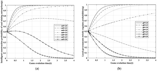 This paper also explores the effects of labor, mental, and psychological costs on the evolutionary game between the two parties. Taking Figure 8a as an example, we take the initial values p = 0.5 and q = 0.5 and set the loop function for m0 = 2.0:0.5:5.0. It can be seen that, to a certain extent, the lower the labor cost of intelligent construction of coal mining enterprises, the faster the speed of coal mining enterprises and local governments in choosing the ideal state. The government should make enterprises deeply aware of the benefits of this transformation for the enterprise, eliminate the cognitive barriers and labor cost obstacles to intelligent construction, so that enterprises are willing to actively invest funds to drive production and operations. With the continuous increase in labor cost m0 for the implementation of intelligent construction in coal mine enterprises, the trend of the evolution system converging to 1 gradually becomes smooth. When the critical value m0 = 3.7 is exceeded, the probability of intelligent construction in coal mine enterprises no longer evolves in the direction of 1 but tends towards 0. Similarly, the evolutionary trend of m1, the mental cost paid by coal mine enterprises to implement intelligent construction, is roughly the same as that of m0, and its critical value is about 3.9 after simulation. However, the psychological cost m2 path of coal mine enterprises that have not implemented intelligent construction is just the opposite of m0, and the implementation probability of intelligent construction will increase with the increase of m2.