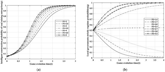 The main difference between the spillover penalty mechanism and the non-spillover penalty mechanism is that qF1, a cost account, is added when the coal mine enterprises fully implement intelligent construction. Therefore, Figure 9a shows an evolutionary simulation based on the influence of F1, a single variable, on the probability of intelligent mine construction behavior of coal mining enterprises. In order to facilitate observation, the initial value of probability q of strict regulation by local governments and probability p of fully implementing intelligent construction in coal mining enterprises is 0.05; the initial value of F1 is 2.0–4.0, and the step size is 0.5. As can be seen from the figure, with the increase in the number of fines imposed on enterprises by the government, the growth rate of the probability of enterprises fully implementing the intelligent construction of coal mines continues to increase. This situation shows that, to a certain extent, the government’s appropriate increase in fines can urge coal mining enterprises to improve intelligent construction quickly. Similarly, the rate of strict government regulation is plotted on the vertical axis, resulting in an image with a trend comparable to that observed in Figure 9a. This indicates that an increase in fines accelerates the system to a certain extent, ultimately reaching a steady state, while not influencing the final strategies of the two parties. The impact of F2 on the government’s strategic approach differs significantly from that of F1. In order to facilitate observation, the following values have been selected for analysis in this paper: F2 = 1.4, F2 = 1.7, F2 = 2.0, F2 = 2.3, F2 = 2.7, F2 = 3.0, F2 = 3.3. As illustrated in Figure 9b, when F2 is less than the critical value of 2.3, the government tends to pursue deregulation; when it is greater than 2.3, the government intensifies strict regulation in line with the amount of fine. This indicates that the value of F2 will influence the government’s ultimate evolutionary decision.