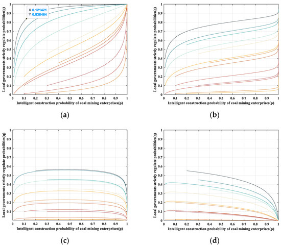 In the context of local government, when the resources consumed by strict supervision are excessive, and the perceived benefits of strict local government control are not as advantageous as those of relaxed supervision, local governments will choose the latter. When the pressure of external social supervision is excessive, and media and public opinion about coal mine pollution intensifies in the context of coal mining enterprises, the cost of not implementing intelligent construction rises significantly. Consequently, the enterprise is inclined to implement intelligent construction in its entirety. The final evolutionary stable strategy is {full implementation, deregulation}, and the specific evolutionary trend is illustrated in Figure 3e,m,n.
