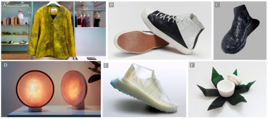 BC and SCOBY as a material have mainly been used to create design prototypes in fashion shows and exhibitions rather than in mass production. The primary application appears to be using them as substitutes for leather or textiles. (A): Jacket by Ganni used BC material CELIUM™ by POLYBION™ (https://www.polybion.bio/contact/) (accessed on 9 September 2024) [23]; (B): Shoe made out of SCOBY [24]; (C): Shoe made out of self-dyeing shape-grown BC [25]; (D): lampshade made from BC material [26]; (E): shoe out of BC reinforced with nonwoven fabrics [27]; (F): biodegradable, self-gluing packaging material [28].