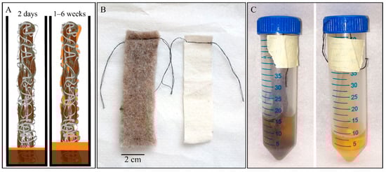 To create the scaffolds, textile samples (sheep wool felt and cotton fabric) were cut into 10 × 2.5 cm strips, sewn on the top edge using cotton yarn, leaving the thread edges (see Figure 2B) to suspend the scaffolds in 50 mL Falcon tubes with a tape (see Figure 2C). The cotton fibre fabric was sourced from the material collection at the School of Product Design, University of Canterbury, New Zealand, and waste sheep wool felt was obtained from discarded packaging waste (Woolpack by Planet Protector, Auckland, New Zealand). The cotton fabric was a plain weave with a thickness of 0.689 mm, a roughened surface, a density of 0.248 g/cm3, and a fibre diameter of 16.13 µm. The sheep wool felt has a thickness of 8.003 mm, a density of 0.048 g/cm3, and a fibre diameter of 34.65 µm. With an absorption capacity of 436.31% for water and 441.06% for kombucha infusion in cotton and 426.09% for water and 405.38% for kombucha infusion in wool felt, no significant difference in absorption capacity was observed between the two materials. These samples will be referred to as DipCo and DipShe, indicating the reinforcement (Co = cotton; She = sheep wool) and a number indicating the week of incubation. Scaffolds were autoclaved in a front-loading benchtop autoclave (3870ELD-C, 85 L, Thermo Fisher Scientific Inc., Waltham, MA, USA) at 120 °C for 15 min prior to addition of infusion inoculate.