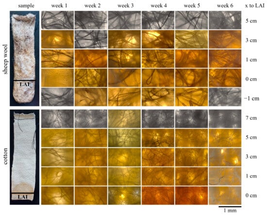From week one, the growth of BC membranes was confirmed on the LAI, indicating that the culture was healthy and that the consortia could produce nanocellulose. Optical microscopy at different heights above the LAI of the samples revealed biofilm growth in the form of thin membranes between the fibres as early as week 1 in the sheep wool and cotton samples, already proving vertical growth (see Figure 3).