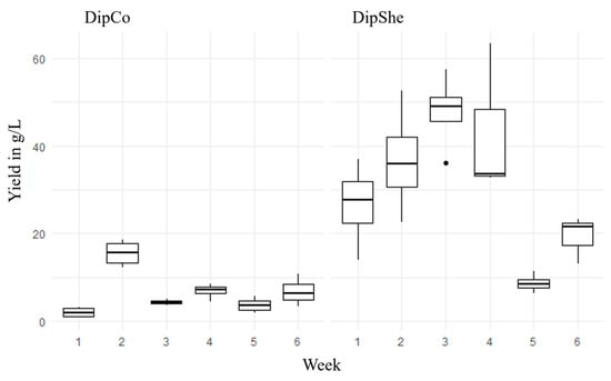 Boxplots showing the yield in g/L per week. Yield was assumed to be the mass change in the scaffold in the dried state before and after the fermentation related to the volume of inoculum provided. DipShe: right; DipCo: left.