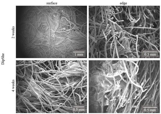 SEM images of DipShe samples from two and four weeks of fermentation compared in their surface (the outside of the fabric stripe) and cross-section (cut through the fabric stripe, facing orthogonally) morphology. These durations were chosen to display and understand the impact of remoistening the scaffolds, which altered the biofilm morphology.
