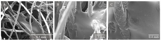 SEM showing the detailed interactions between the wool fibres and the grown nanocellulose membrane in DipShe samples. (A): Membrane attached to fibres forming a film between the wool fibres, (B): nanocellulose membrane wrapping around wool fibres, and (C): grown nanocellulose membrane covering sheep wool fibres.