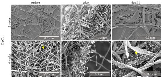 DipCo also presented a BC membrane formation on the sample surface. Compared to DipShe, the membrane formation was much less consistent and showed unfulfilled regions with exposed net-like nanofibres and a rough, bulky surface (see Figure 7). Meanwhile, membranes were also found penetrating the fabrics in DipShe, while in DipCo, the cross-section revealed that membrane attachment predominantly occurs at the superficial fibres. The remoistening showed a crucial impact, tearing the smooth membrane parts and showing a web-like structure with agglomerations highlighted using arrows (see Figure 7). This structure was mostly found on the surface, with very little growth reaching into the fabric.