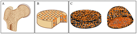 A Schematic representation of some of potential future direction of vertically grown SCOBY composites, (A): using waste bone as scaffold; (B): using stiff specifically designed ceramic or metal scaffolds; (C): ingrown SCOBY in fibrous scaffolds using diverse shapes of the scaffold, e.g., the half sphere on the right. The orange colour represents the SCOBY membrane.