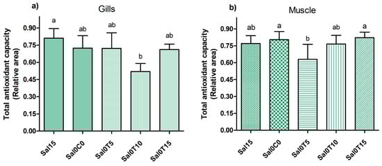 Total antioxidant capacity (ACAP) (mean ± standard deviation) in the gills (a) and muscle (b) at the end of saline stress, in treatments Sal15 (control without algae and at salinity 15 of cultivation), Sal0C0 (control without algae after saline stress), Sal0T5 (diet with 5% macroalgae after saline stress), Sal0T10 (diet with 10% macroalgae after saline stress), and Sal0T15 (diet with 15% macroalgae after saline stress). Different letters represent a significant difference (p < 0.05, Tukey’s test) between treatments.