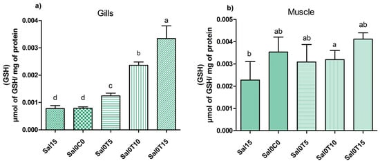 Concentration of reduced glutathione (GSH) (mean ± standard deviation) in gills (a) and muscle (b) at the end of salt stress, in treatments Sal15 (control without algae and at salinity 15 of cultivation), Sal0C0 (control without algae after salt stress), Sal0T5 (diet with 5% macroalgae after salt stress), Sal0T10 (diet with 10% macroalgae after salt stress), and Sal0T15 (diet with 15% macroalgae after salt stress). Different letters represent a significant difference (p < 0.05, Tukey’s test) between treatments.
