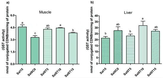 In the muscle, salt stress was shown to reduce detoxification capacity (evidenced by a decrease in GST activity), and the animals that received the inclusion feed were shown to have restored enzyme activity compared with the animals subjected to salt stress. In the liver, salt stress did not induce changes in GST activity; however, the group that received 10% salt stress showed an increase in GST activity compared with the control group without salt stress (Figure 3a,b).