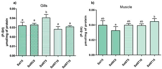 Concentration of sulfhydryl groups associated with protein (P-SH) (mean ± standard deviation) in gills (a) and muscle (b) at the end of saline stress, in treatments Sal15 (control without algae and at salinity 15 of cultivation), Sal0C0 (control without algae after saline stress), Sal0T5 (diet with 5% macroalgae after saline stress), Sal0T10 (diet with 10% macroalgae after saline stress), and Sal0T15 (diet with 15% macroalgae after saline stress). Different letters represent a significant difference (p < 0.05, Tukey’s test) between treatments.