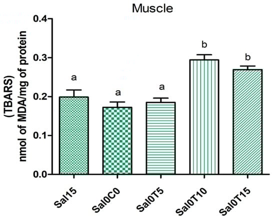 Concentration of thiobarbituric acid reactive substances (TBARS) (mean ± standard deviation) in the muscle at the end of saline stress, in treatments Sal15 (control without algae and at salinity 15 of cultivation), Sal0C0 (control without algae after saline stress), Sal0T5 (diet with 5% macroalgae after saline stress), Sal0T10 (diet with 10% macroalgae after saline stress), and Sal0T15 (diet with 15% macroalgae after saline stress). Different letters represent a significant difference (p < 0.05, Tukey’s test) between treatments.