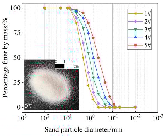 To obtain quartz sand specimens with varying particle gradation, we proportionally blended predetermined percentage fractions of different particle sizes to fabricate five distinct test specimens (Table 1), designated as Specimens 1# through 5#. The particle size distribution curves for all specimens are presented in Figure 1, with median particle diameters (d50) measuring 2.01 mm, 1.59 mm, 1.15 mm, 0.71 mm, and 0.43 mm, respectively.