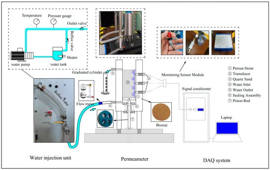 A custom-designed hydrodynamic seepage testing system was developed for this investigation, comprising three core components: a water injection unit, a permeameter, and pressure monitoring modules (Figure 2). The water injection unit integrates a heater and a water pump to regulate water temperature and flow rate. The heater maintains water temperature within a preset range throughout the experiment (operational range: 5–50 °C), while the pump adjusts flow via a reflux pipeline and valve system, ensuring stable injection velocities that meet hydrodynamic seepage requirements. As the core component, the permeameter houses the specimen and injects water upward through its basal inlet, simulating subsurface seepage processes to investigate soil permeability (flow direction indicated by arrows in Figure 2). The LZB-WB glass rotameter monitors real-time flow rates (25–250 mL/min range) to maintain target hydrodynamic velocities. SCYG 314 micro-pressure transducers (accuracy: ±0.1% FS) are installed at multiple specimen elevations to track pressure variations during seepage, elucidating physical state transitions during quicksand evolution. All operational parameters are recorded and monitored in real time by the data acquisition system, ensuring data integrity for subsequent analysis.