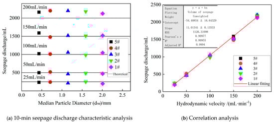 Experimental results delineate the permeability variation patterns of quartz sand under distinct particle gradation. The relationship between median particle diameter (d50) and seepage discharge is plotted in Figure 3a. Key findings reveal that seepage discharge remains independent of d50 across all hydrodynamic velocity conditions, indicating minimal influence of median particle size on porosity for the five specimen groups.