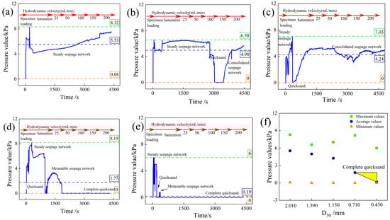 Due to the occurrence of complete quicksand failure at the top layer, the pressure variation trends during specimen loading and permeation were further analyzed, as shown in Figure 4f. The maximum pressure values consistently occur during the loading and initial saturation phases, independent of gradation variations, thereby validating the accuracy of the specimen preparation protocol described in Section 2.3. The average pressure values decrease progressively with reductions in median particle diameter (d50), indirectly indicating a critical average pressure of 1.77 kPa for complete quicksand initiation in quartz sand. The minimum pressure values remain near 0 kPa, confirming the proper functioning of the pressure sensors and further verifying the reliability of the newly developed experimental apparatus.