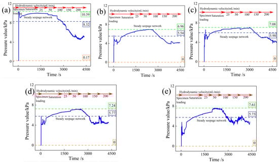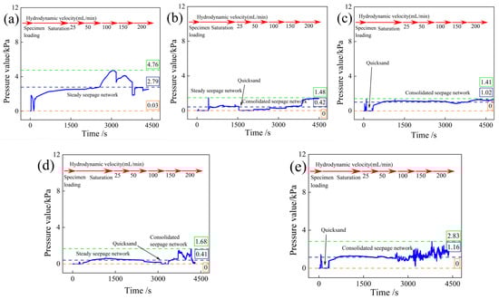 Sensor pressure values at middle height positions of quartz sand samples: (a) Specimen 1# (d50 = 2.010 mm); (b) Specimen 2# (d50 = 1.590 mm); (c) Specimen 3# (d50 = 1.150 mm); (d) Specimen 4# (d50 = 0.710 mm); (e) Specimen 5# (d50 = 0.430 mm).