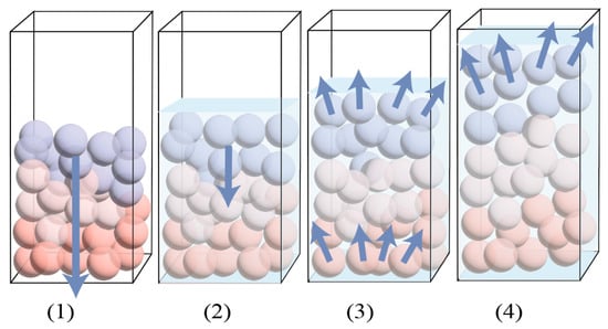 Soil is a three-phase system composed of solid particles, liquid water, and gas []. As a common natural soil type, sandy soil is highly susceptible to quicksand geohazards. Based on experimental results and theoretical analysis, the quicksand evolution process can be categorized into three distinct stages: self-consolidation, reorganization, and quicksand initiation. During the experiment, the self-developed dynamic water infiltration test apparatus, in conjunction with miniature pressure sensors, accurately monitored pore pressure variations at different depths, ensuring high precision and reliability of the data. Notably, under varying dynamic water velocities and particle gradation conditions, the equipment demonstrated excellent stability and consistency, providing a robust experimental foundation for investigating the physical mechanisms of quicksand state transitions. Integrating the findings with the visualized numerical simulations by Mansouri et al. [], a schematic diagram of the quicksand evolution process is presented in Figure 7.