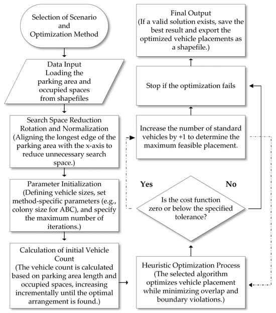 The optimization workflow for searching for the optimal and maximum number of parked vehicles for each method and scenario is illustrated in Figure 2.