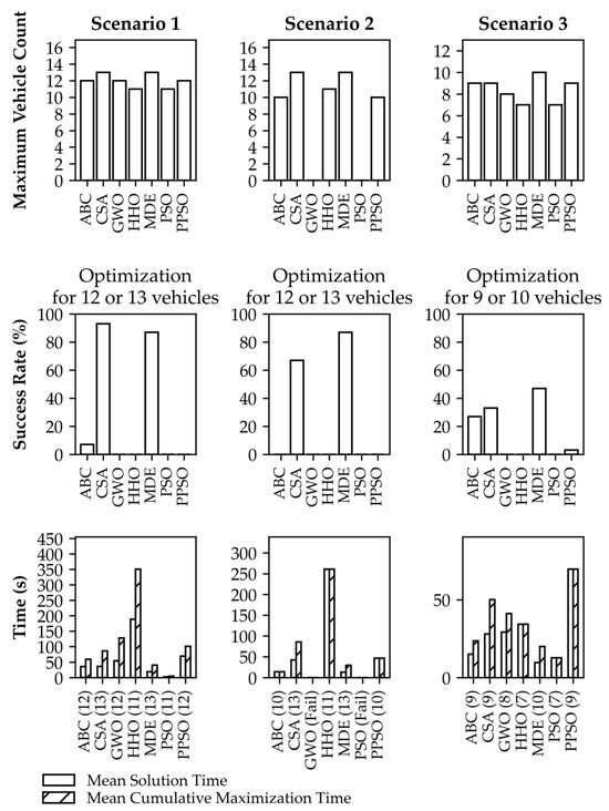 According to Table 3, the MDE algorithm provided the fastest solution, placing 10 vehicles in an average of 9.65 s. The ABC (14.91 s), CSA (27.88 s), and PPSO (69.63 s) algorithms required significantly more time, while GWO (29.15 s), HHO (34.22 s), and PSO (12.66 s) exhibited lower efficiency. In terms of cumulative maximization time, MDE achieved the best efficiency with a total computation time of 19.92 s, while CSA and ABC required 50.10 and 23.55 s, respectively.