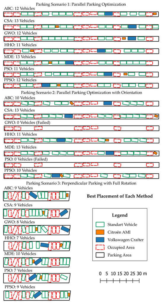 Figure 4 presents the best vehicle placement configurations achieved by each method across different scenarios. In Scenario 1, the ABC method utilized the small remaining space at the end of the parking area by placing a Citroën AMI, while the CSA method attempted to fit a standard vehicle within this space by pushing the cost function tolerance limits. Since ABC, GWO, HHO, PSO, and PPSO placed fewer vehicles, they resulted in a more flexible parking arrangement. In contrast, MDE successfully accommodated 13 vehicles. If the small remaining space at the end of the parking area had been used, a second AMI could have increased the total vehicle count to 14. However, to ensure a standard comparison across all methods, only one AMI and one Crafter were included in each scenario. Scenario 1 demonstrated that the Volkswagen Crafter did not pose significant challenges, while Figure 4 highlights the importance of developing flexible solutions for unmarked parking areas.