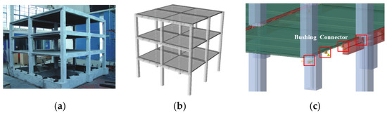 To validate the rationality of the modeling method for prefabricated concrete frame structures in this study, based on parameters from [5] establishing the prefabricated frame structure model, and considering that superstructure responses under subway vibrations generally remain elastic, only simulated vibration frequencies were compared with experimental measurements. A 1/5-scale experimental specimen was constructed as a three-story, three-bay precast RC frame consisting of inverted L-shaped edge beams, inverted T-shaped middle beams, bracket columns, and prefabricated slab components. Slab-to-beam connections employed bolted joints through slab ribs, with beam–column connections similarly bolted and subsequently grouted with concrete to fill joints. The structural configuration is illustrated in Figure 2a.