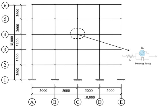 Semirigid joints typically employ connection types such as bolt-welded hybrid connections, prestressed prefabricated connections, and bolted connections. Given that upper structures predominantly remain within the elastic range under subway-induced vibrations, linear spring elements were adopted in linear elastic simulations to represent the rotational stiffness effects of semirigid joints on the global stiffness matrix, as schematically shown in Figure 1.