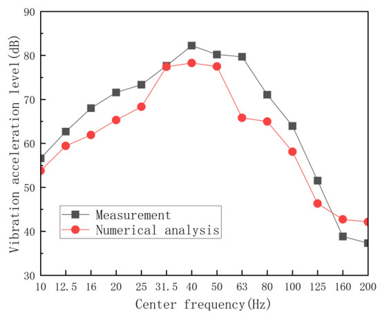 Figure 6 compares the one-third octave band results between the computational model and experimental measurements from Reference [10]. The model’s vibration responses exhibited consistent growth-attenuation trends with field data across center frequencies. Prior to 40 Hz, vibration acceleration magnitudes exhibited frequency-proportional amplification, whereas post-40 Hz spectral components displayed graded high-frequency attenuation. Both model and measurements showed peak energy at 40 Hz, with a 4.8% discrepancy. Within the 10–50 Hz dominant frequency range for subway-induced environmental vibrations, the model demonstrated superior simulation fidelity.