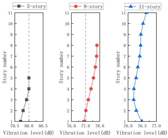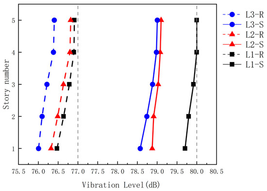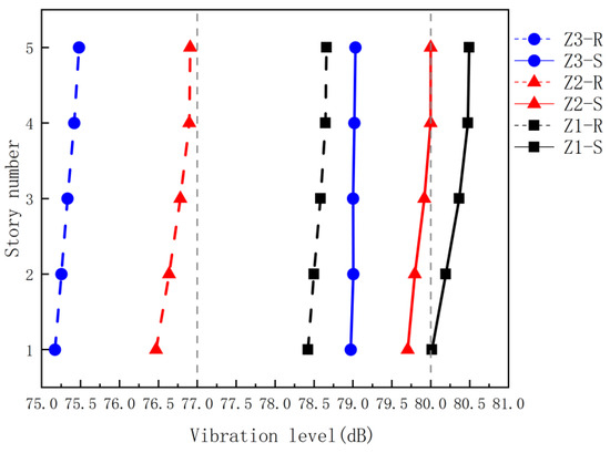 Triaxial vibration signals (X/Y/Z directions) generated by an 80 km/h six-car metro train above the tunnel’s central axis were applied to the six models through a base-uniform excitation protocol. After signal processing of midspan edge beam nodal vibrations, frequency-weighted acceleration levels across floor monitoring points were obtained as shown in Figure 13.