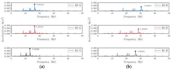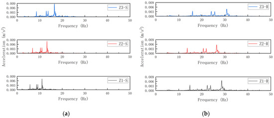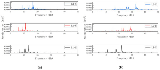 To assess the frequency-dependent energy accumulation caused by metro vibrations in structures with different total story numbers, mixed-direction acceleration time histories were collected from midspan nodes of edge beams at the first-, intermediate-, and top-floor levels. The data were processed via FFT to derive the corresponding spectral data, as illustrated in Figure 25.