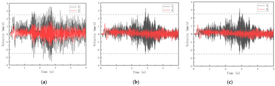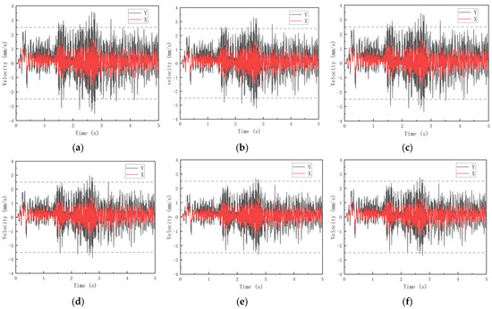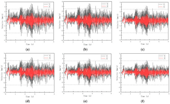 To further study the influence of the variation of column cross-sections on the structural vibration velocity in the time domain, the X- and Y-direction velocity time histories at the central position of the top floor of each structure were extracted, as shown in Figure 15. The peak velocities in the time domain were extracted and are shown in Table 9.