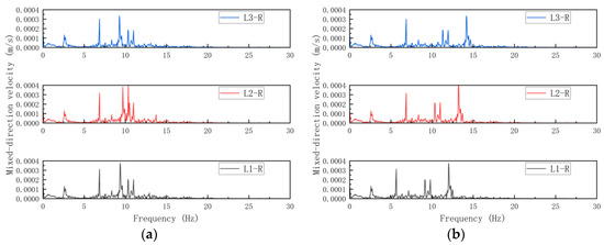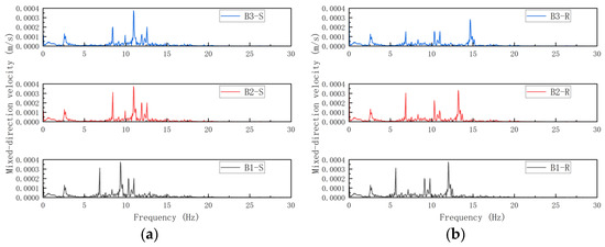Beyond time-domain analysis of subway vibration impacts, frequency-domain velocity investigations are required to identify critical frequency bands prone to energy accumulation and structural fatigue damage. Combined directional velocity time-history data at midedge beam nodes of top floors were extracted and processed via FFT, yielding composite velocity spectral data shown in Figure 11.