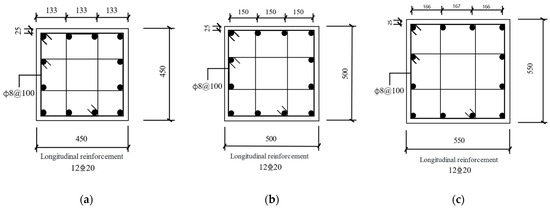 Consistently with Section 2′s design criteria, structural parameters were input into PKPM2025R2.3 to generate reinforcement layouts for all models. Uniform column reinforcement patterns based on ground-floor central column designs were implemented across models, with cross-sectional reinforcement details illustrated in Figure 12. Joints utilized four M20 (Grade 8.8) high-strength friction-grip bolts in a dual-row symmetric arrangement, with 12 mm splice plates matching parent material properties. Translational stiffness = 2.8 × 109 N/m and rotational stiffness = 1.83 × 108 N·m/rad were assigned, with structural maintained at 0.5. Bushing connectors simulated semirigid joints for the Z1-S/Z2-S/Z3-S models, while Beam connectors represented ideal rigid joints in the Z1-R/Z2-R/Z3-R series.