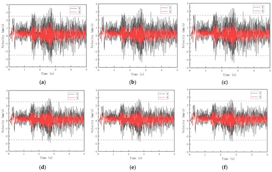 In addition to evaluating human comfort through structural acceleration responses, investigating vibration kinetic energy transmission via velocity parameters [13] is crucial for understanding transient structural impacts induced by peak velocities in the time domain. X-/Y-direction velocity time-history diagrams at central roof locations are shown in Figure 10, with corresponding time-domain peak velocities extracted in Table 7.