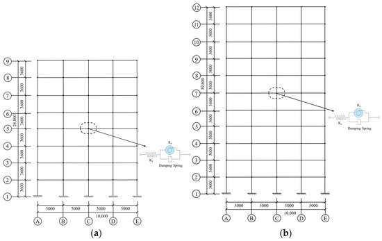 Calculation verification demonstrated that joints utilized four M20 (grade 8.8) high-strength friction-grip bolts in a dual-row symmetric configuration, accompanied by 12 mm splice plates with material properties identical to parent components, fulfilling all structural joint design criteria. Translational stiffness = 2.8 × 109 N/m and rotational stiffness = 1.83 × 108 N·m/rad were assigned, maintaining = 0.5. Schematic diagrams of finite element models with different story configurations are shown in Figure 4 and Figure 21.