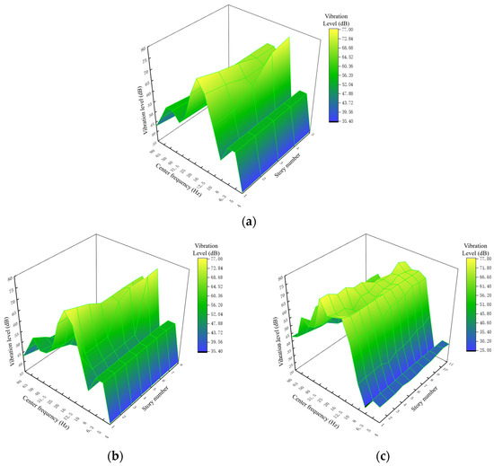 One-third octave vibration levels at the measuring points on each floor of models with different numbers of stories: (a) the 5-story model; (b) the 8-story model; (c) the 11-story model.